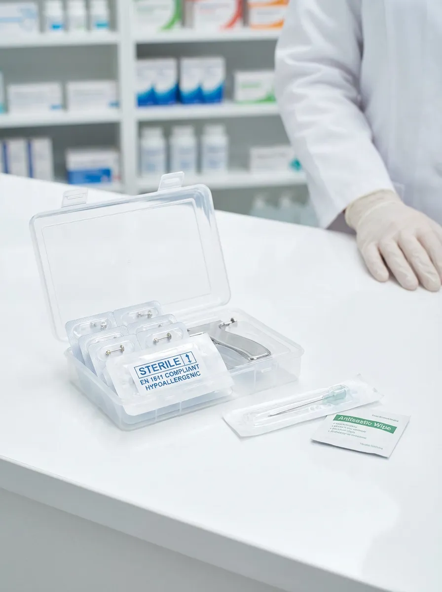 Стерильные растворы для аптек и киосков прокалывания ушей, расширяющиеся до прокалывания носа. Мы производим простые, капсулированные носовые штифты с острыми наконечниками для пистолетов для прокалывания или одноразовых игл, строго соблюдая EN 1811 Выделение никеля .