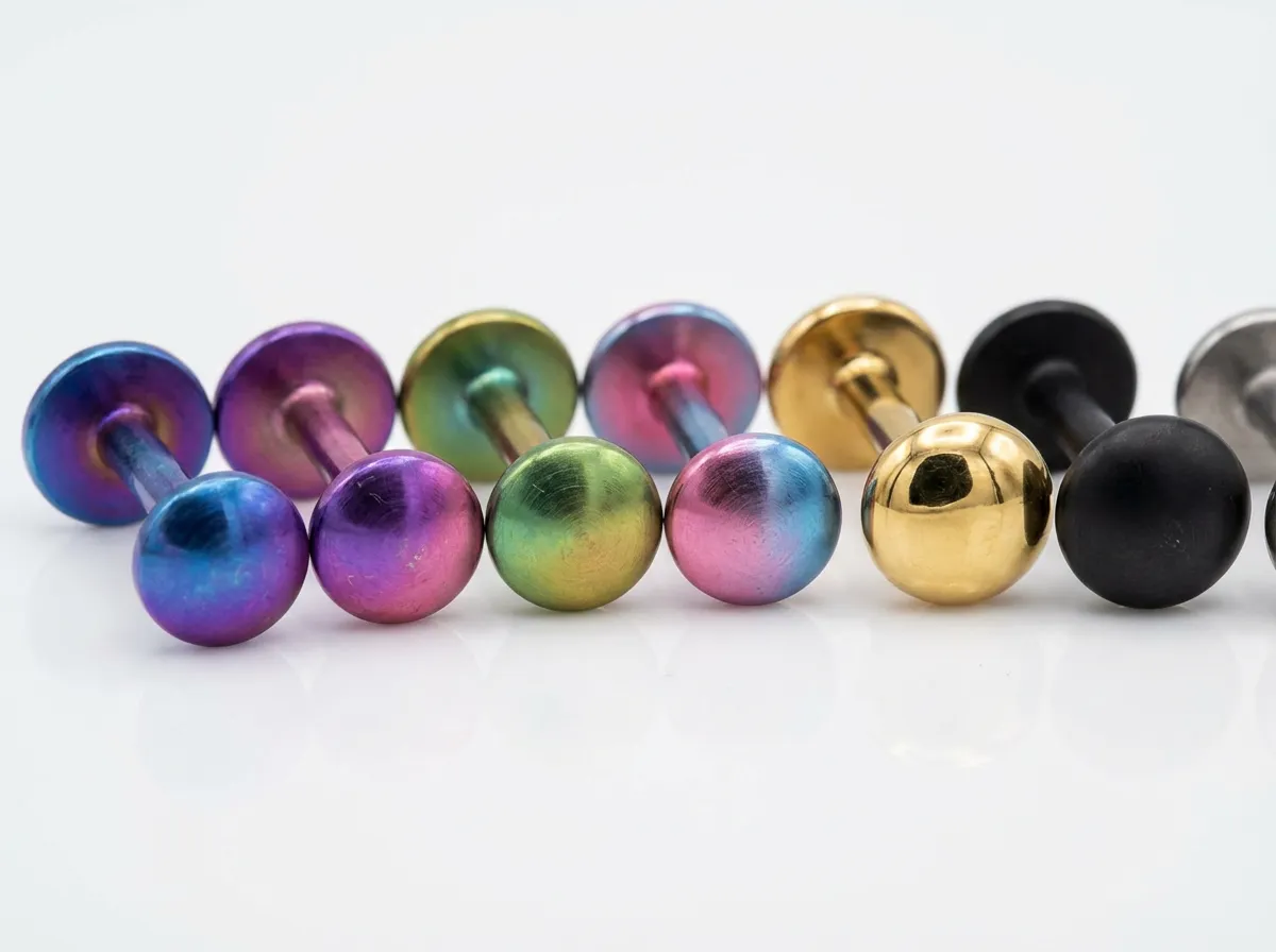 Для титана мы предлагаем Анодирование (Цвет, управляемый напряжением), которое безопасно для свежих проколов. Для стали мы используем Биосовместимый PVD для золота и черных покрытий.